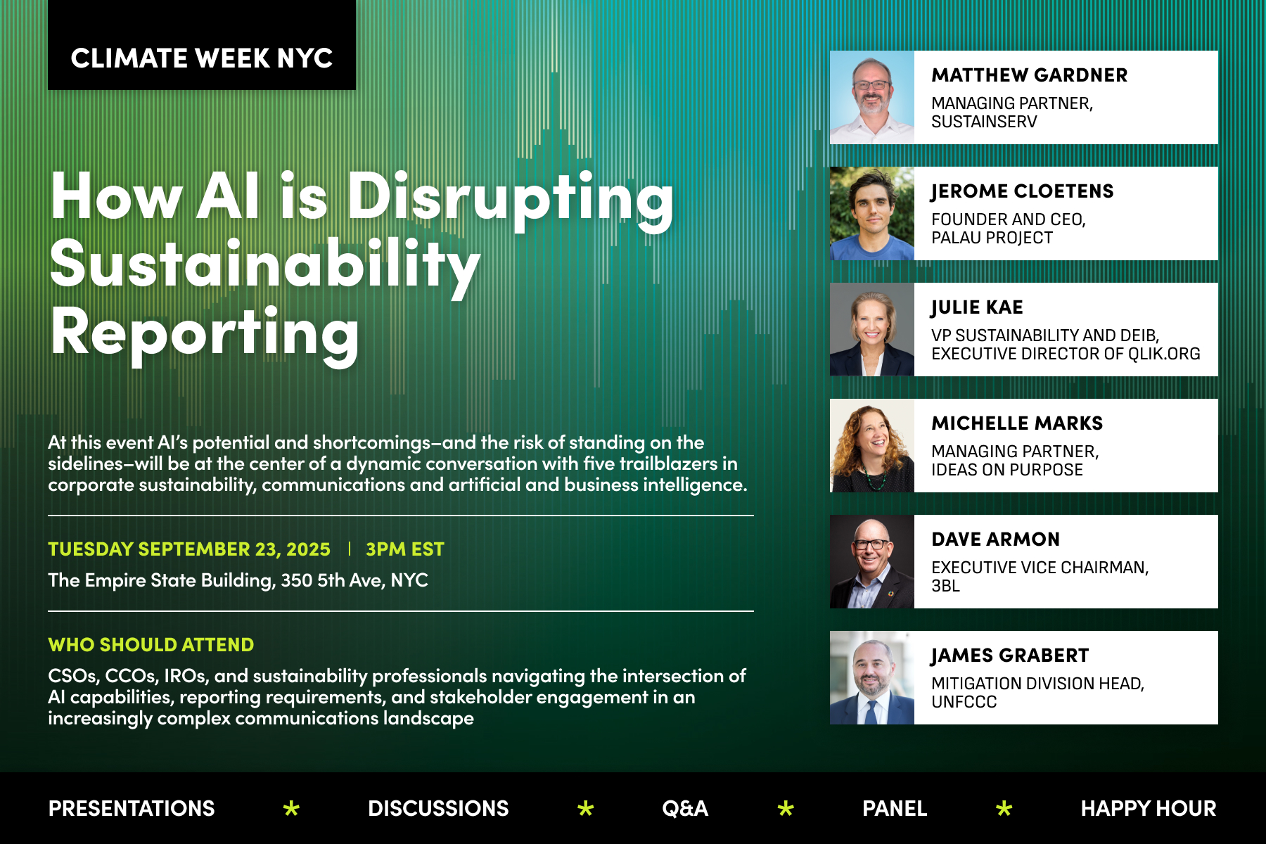 At this event AI’s potential and shortcomings–and the risk of standing on the sidelines–will be at the center of a dynamic conversation with four trailblazers in corporate sustainability, communications and artificial and business intelligence.